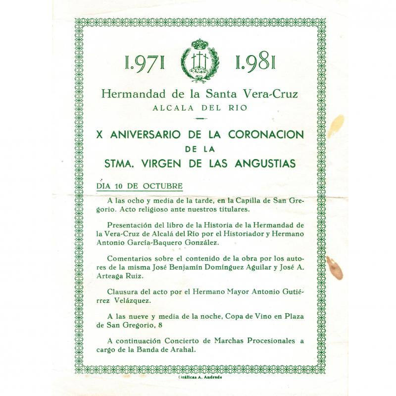 Con la previa presentación, el día 9, del Boletín del X aniversario de la Coronación por parte del Grupo Joven. El 10 de octubre se celebró Santa Misa Solemne conmemorativa en el presbiterio de San Gregorio, ante nuestros Titulares, con motivo del X aniversario de la Coronación. Tras la misma se presentó el libro “La Hermandad de la Vera-Cruz: Apuntes para la Historia”, primer libro publicado sobre la historia de Alcalá del Río y su Hermandad de la Vera-Cruz. Se celebró un concierto de la Agrupación Musical Santa María Magdalena de Arahal