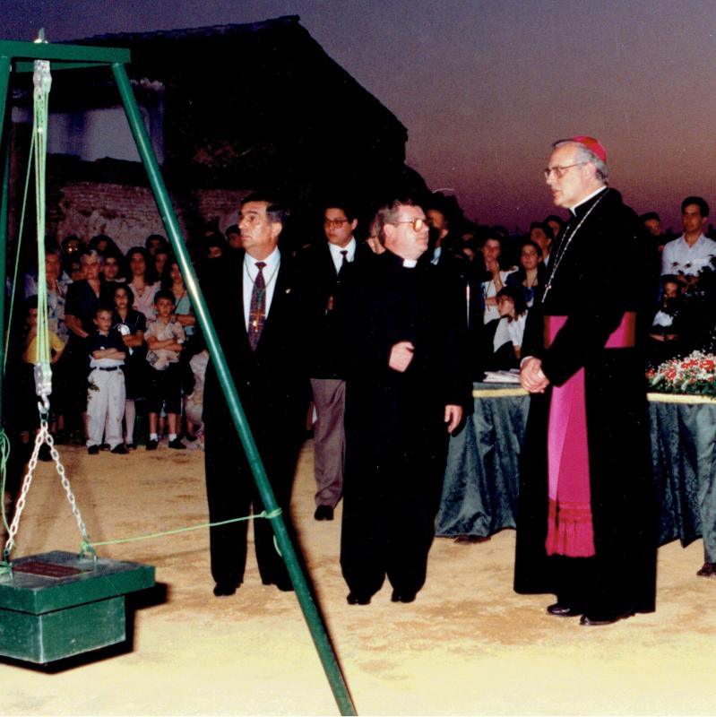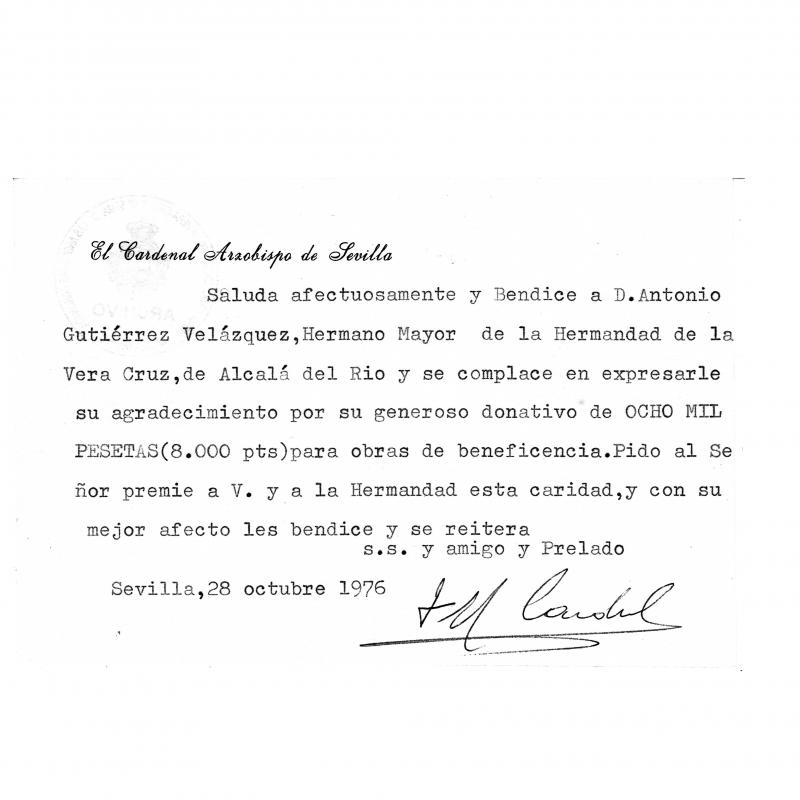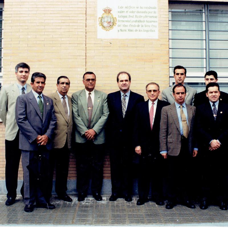 Fray Carlos Amigo Vallejo, Arzobispo de Sevilla, coloca la primera piedra del Edificio Vera-Cruz. A tal efecto, se preparó y adecentó el solar, se realizó solemnemente el rito de colocación de la Primera Piedra junto con objetos significativos de la fecha (monedas, periódicos y boletines) y se culminó con unas sentidas palabras que todos los asistentes aplaudieron con emoción. Del discurso del Hermano Mayor, tremendamente comprometido y esclarecedor respecto a lo que se pensaba hacer allí, merecen ser subrayadas algunas palabras, como las de: “en la Fundación Vera-Cruz el lugar preferente no será para el hermano más antiguo, sino para el alcalareño más necesitado....”