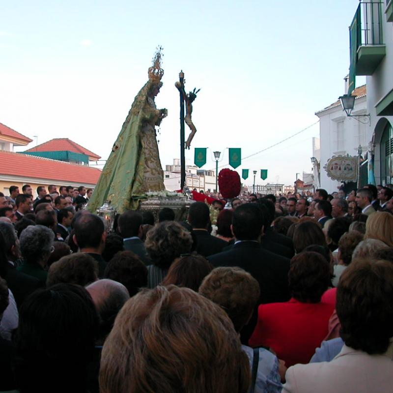 El Santísimo Cristo de la Vera-Cruz en su paso y a su pies, María Santísima de las Angustias, igual que procesionó en 1971 recién coronada por el Cardenal Bueno Monreal, de recordada memoria. El ambiente de la mañana del 6 de octubre, engalanado de recuerdos y aromas que nos transportaban a otros lugares y a otros tiempos: las calles, recién regadas, lucían pletóricas de colgaduras, banderolas y jarrones de flores. A las 8,30 h y ante el paso se rezó el Santo Rosario y celebró la Santa Misa. Seguidamente, se organizó meticulosamente la procesión: Cruz de Guía acompañada de faroles, filas de hermanos con cirios formados en veinticinco parejas (años transcurridos), insignias marianas, servidores de librea (pajes), ciriales, incensarios, ante presidencia de autoridades y presidencia de la Hermandad. Alrededor, multitudinario número de hermanos, mayoritariamente con traje oscuro, y de hermanas ataviadas con mantilla blanca. A las diez de la mañana, a los pies del Santísimo Cristo de la Vera-Cruz, la venerada imagen de la Santísima Virgen de las Angustias hacía acto de presencia, enmarcada bajo el dintel de su Ermita, justo en el momento en el que el sol alcanzaba el ángulo exacto para bañar de luz su cara, como una afrenta, como una invitación a relativizar todas las cosas mundanas. Allí, envuelta en su presencia mítica y con su perfil de ensueño, se mostraba soberana, sin más compañía que su Bendito Hijo. A su entrada en el templo parroquial, comenzó el Acto de Exaltación a María Santísima de las Angustias, que estuvo a cargo de nuestro hermano D. José Ignacio Zambrano Carranza.